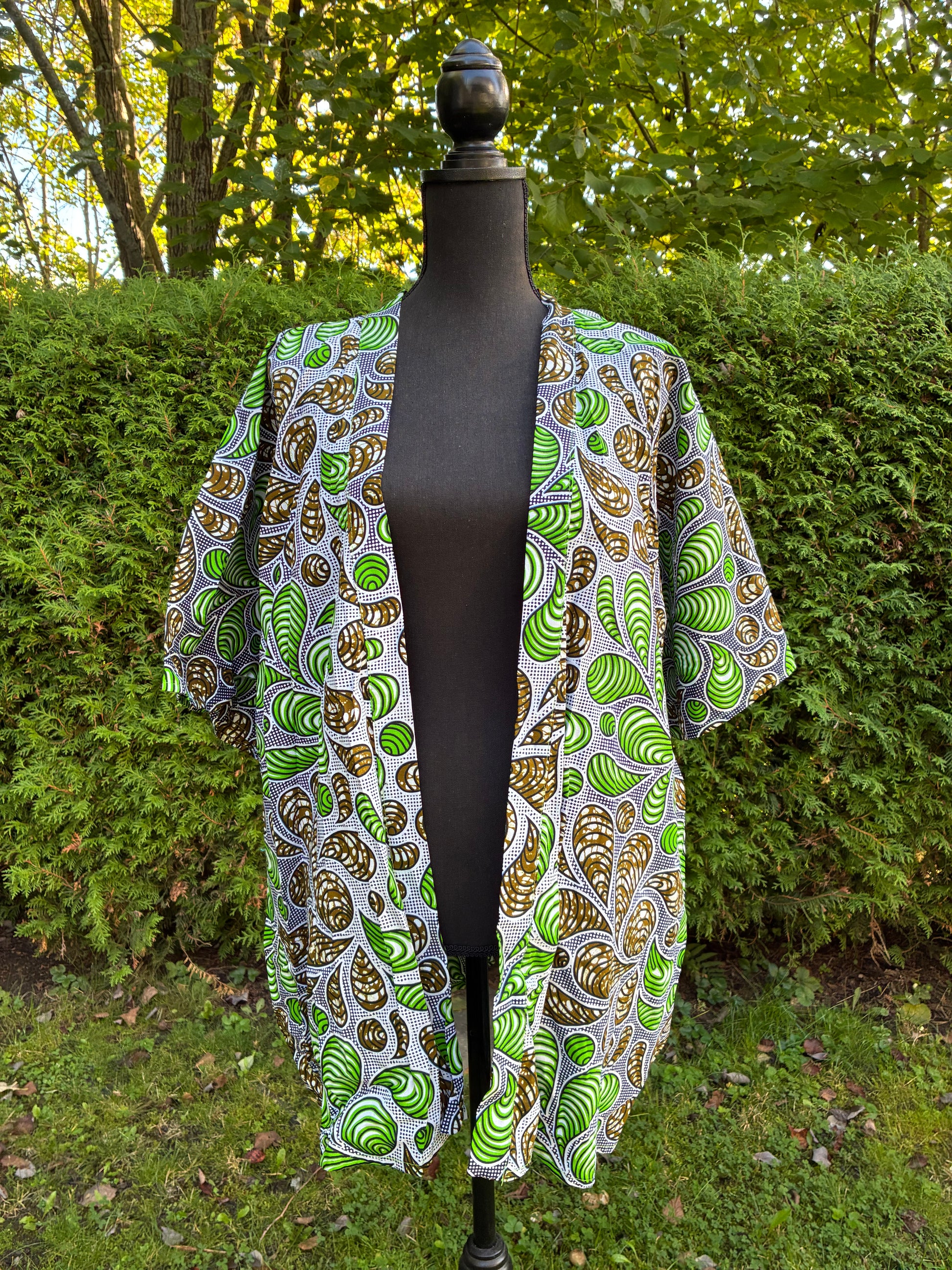 En allsidig og komfortabel kimono i fargerikt afrikansk stofftrykk, designet for å passe alle – uavhengig av kjønn, størrelse eller anledning. Den løse passformen gir god bevegelsesfrihet og en avslappet stil. Kimonoen har praktiske lommer og leveres med belte i matchende stoff. Bruk den åpen for en uformell look, eller knytt den i livet for en mer definert silhuett.