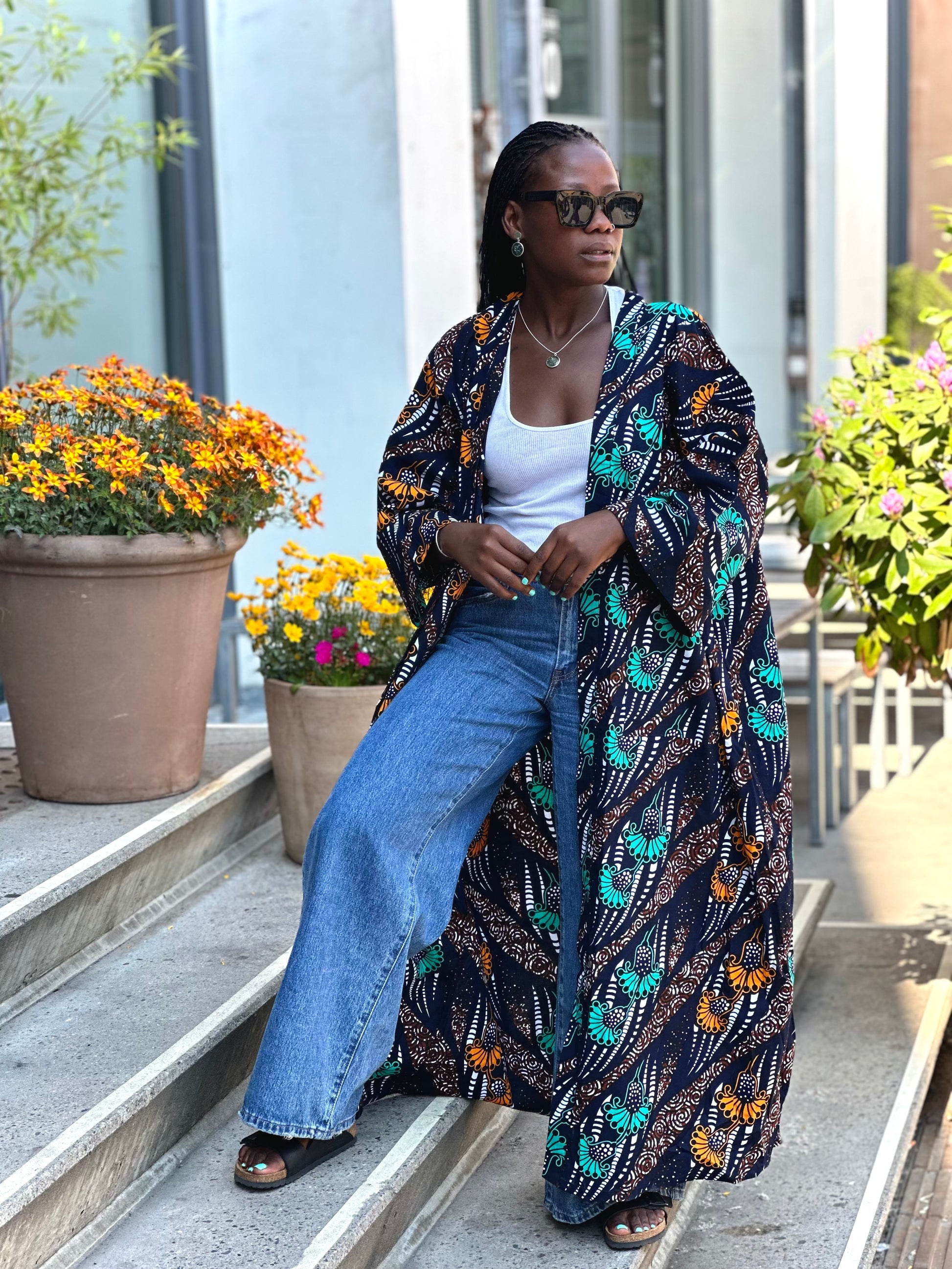 En allsidig og komfortabel kimono i fargerikt afrikansk stofftrykk, designet for å passe alle – uavhengig av kjønn, størrelse eller anledning. Den løse passformen gir god bevegelsesfrihet og en avslappet stil. Kimonoen har praktiske lommer og leveres med belte i matchende stoff. Bruk den åpen for en uformell look, eller knytt den i livet for en mer definert silhuett.