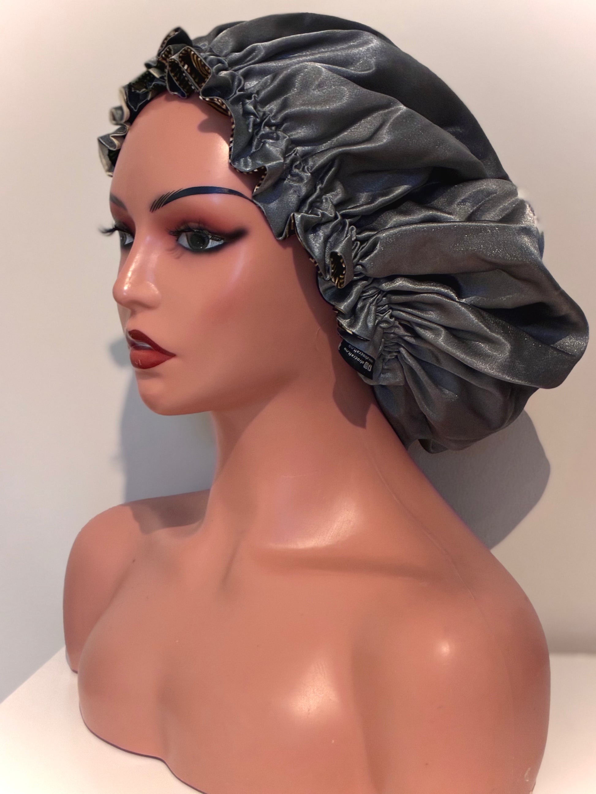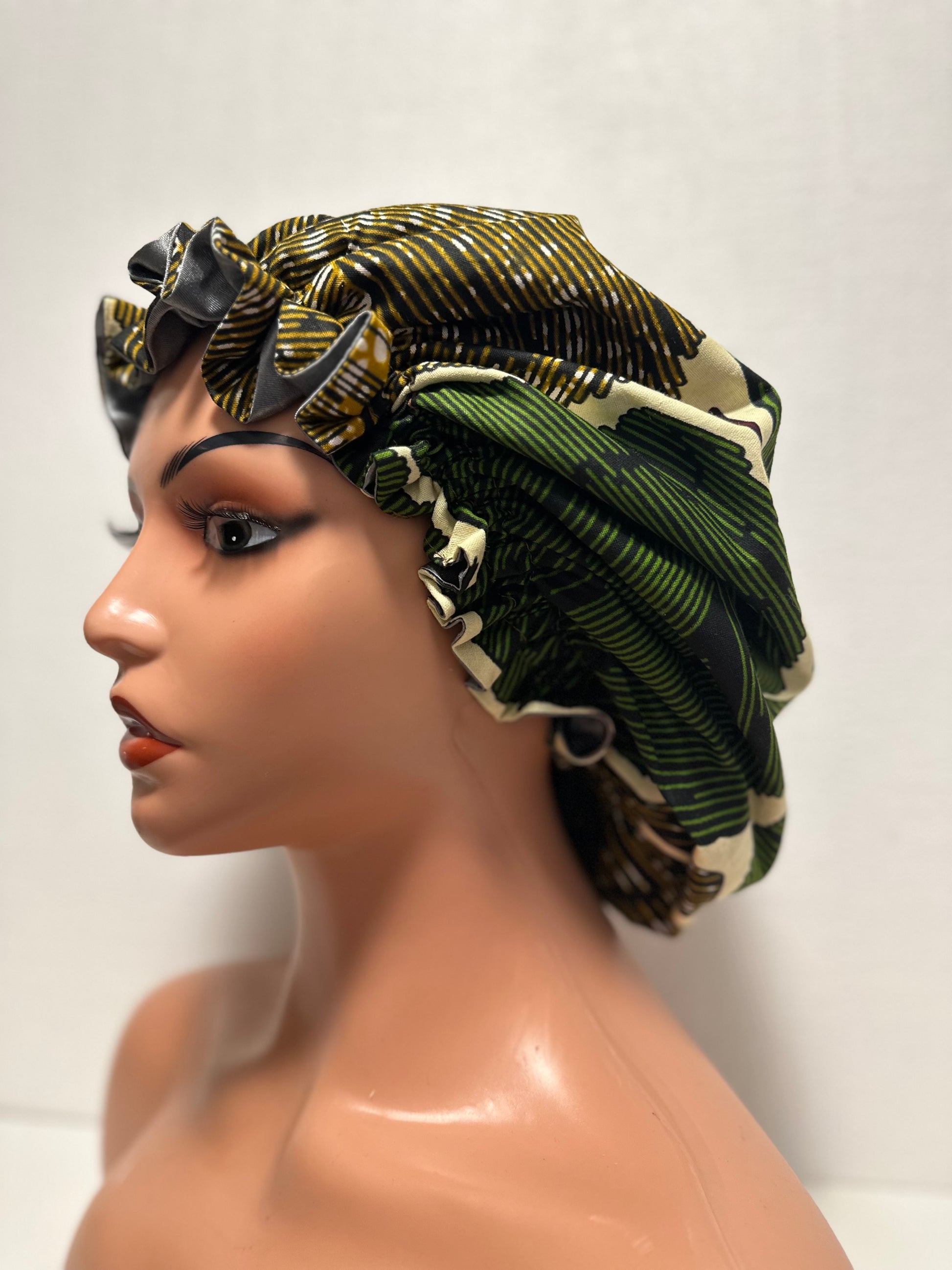 Unik, stilig og funksjonell hårbonnet med to sider – afrikansk stoff på den ene, myk sateng på den andre. Satengen beskytter håret mot friksjon og slitasje, mens capulana-stoffet gir et fargerikt uttrykk. Den justerbare passformen gjør at den sitter godt på både voksne og barn.