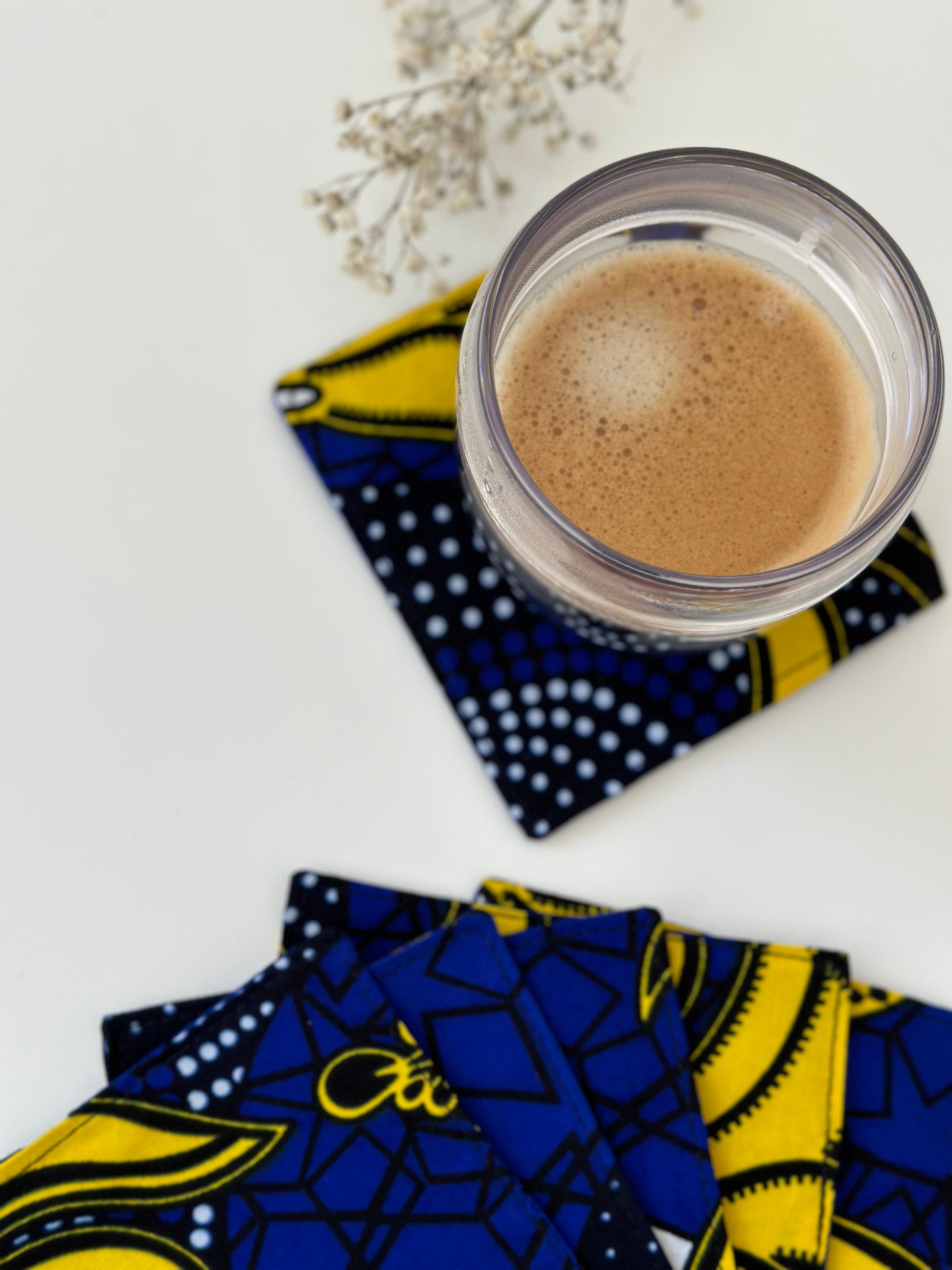 Stilige kvadratiske glassunderlag i fargerikt afrikansk stofftrykk som beskytter bordet mot både varmeskader og flekker. Bruk dem under glass, kopper eller små skåler for å kombinere funksjon og dekor.