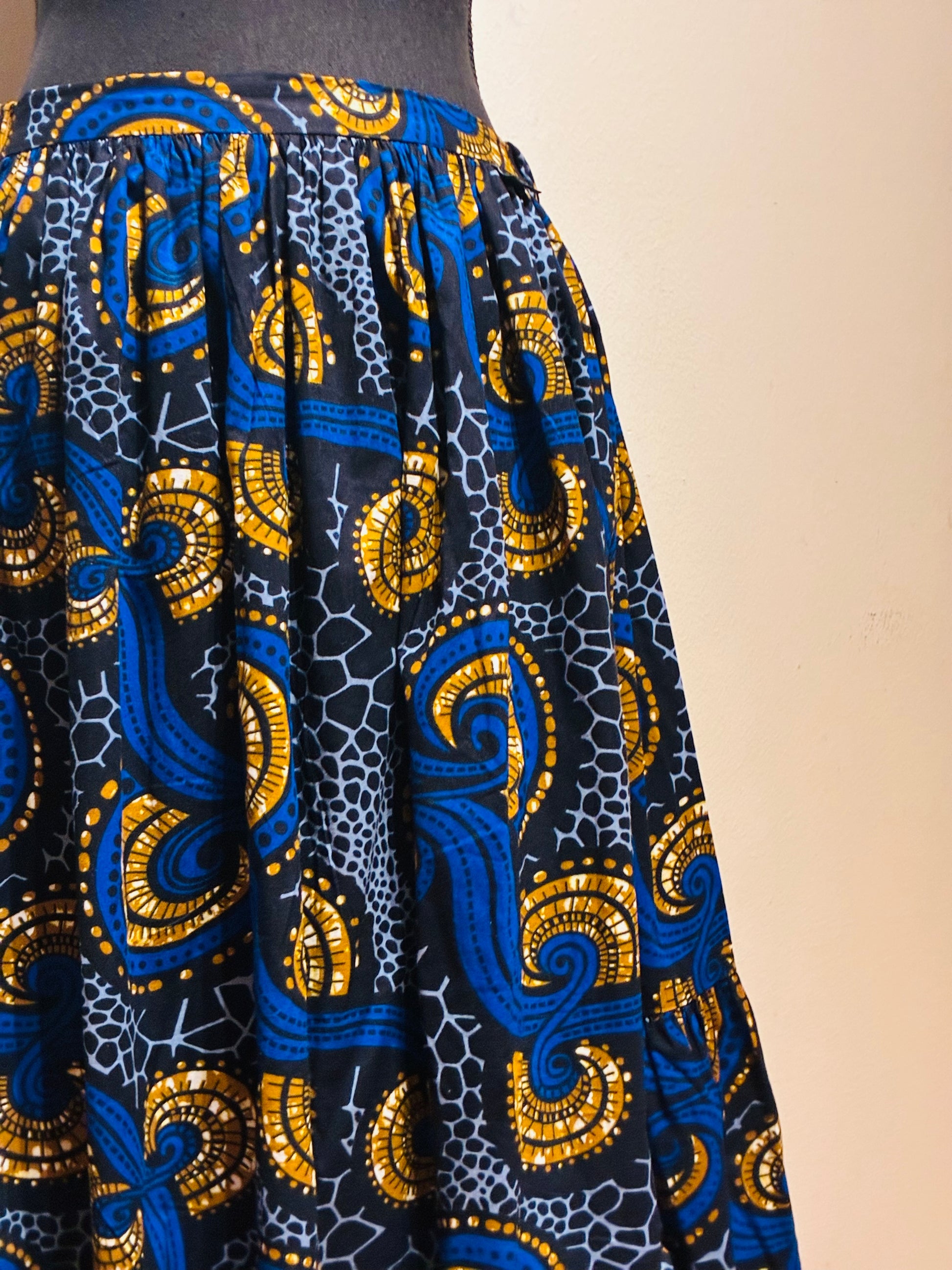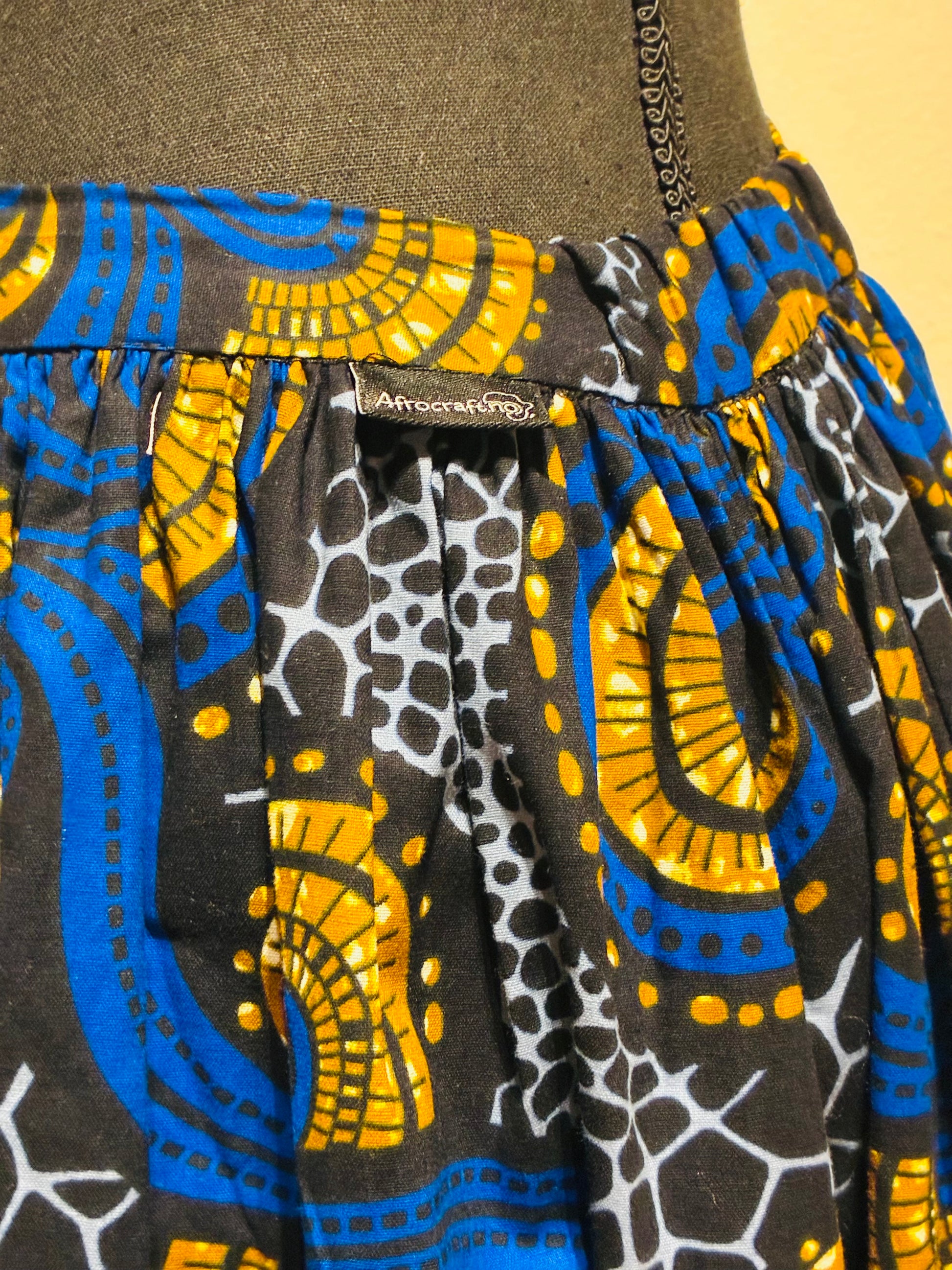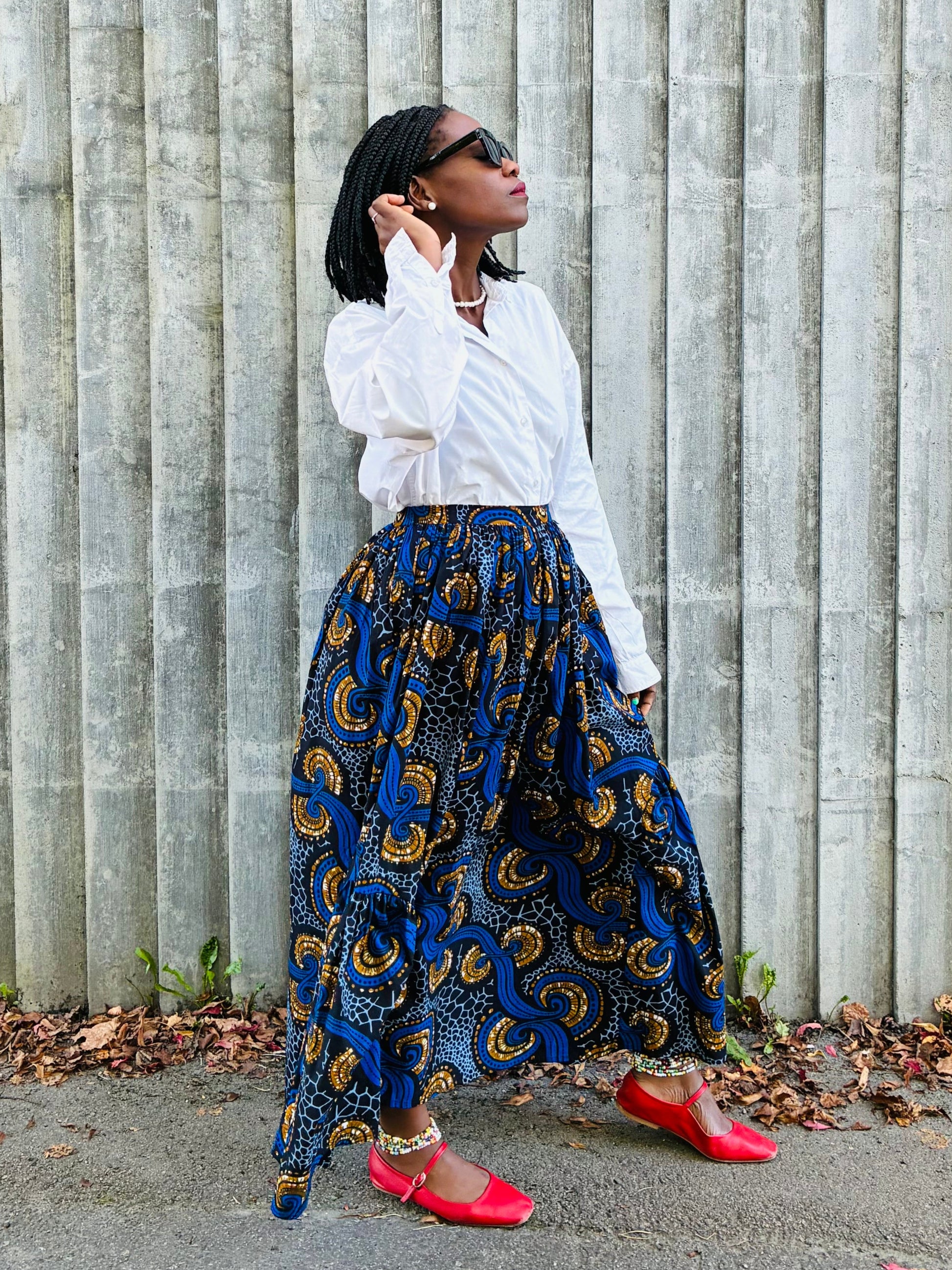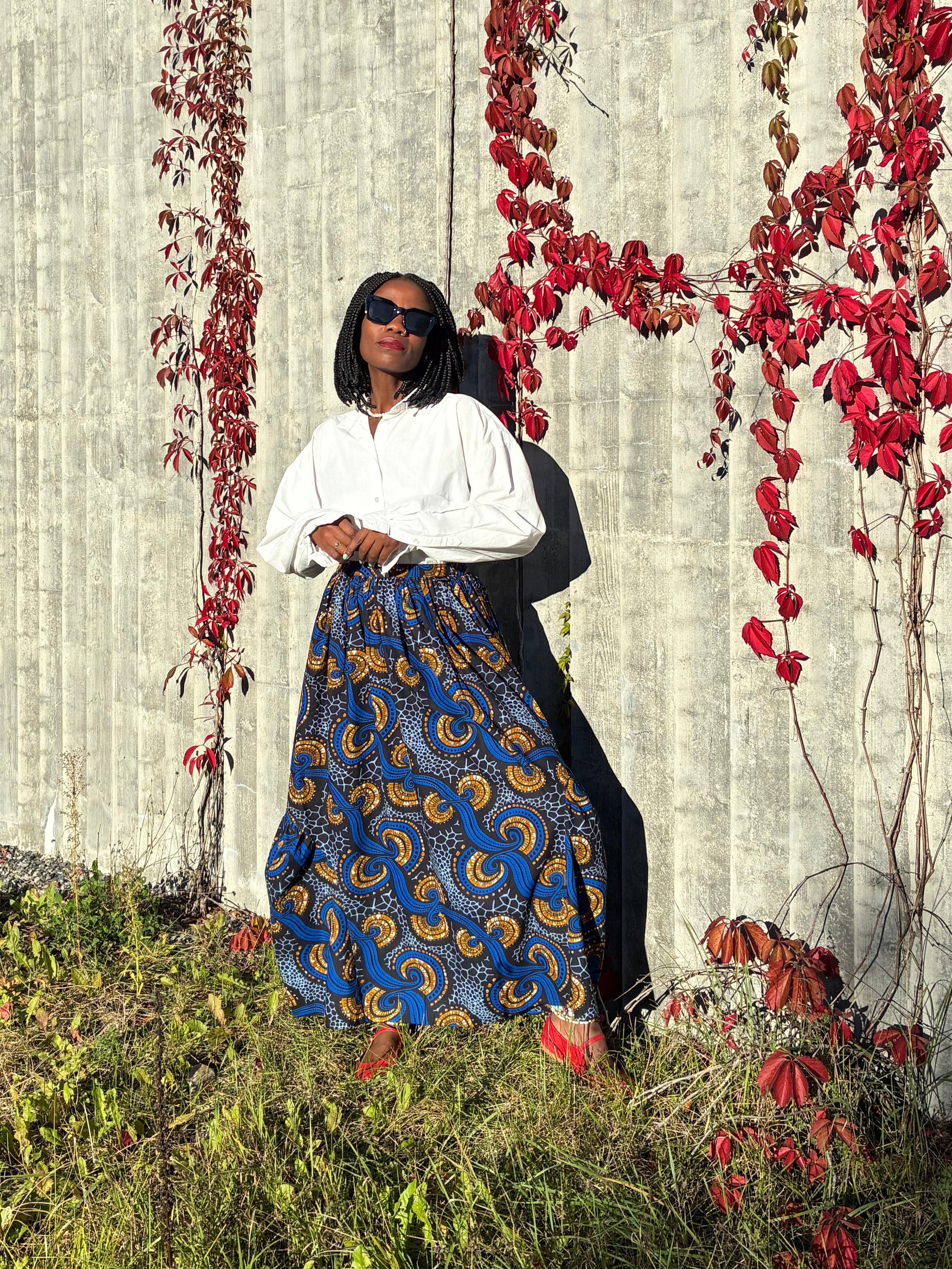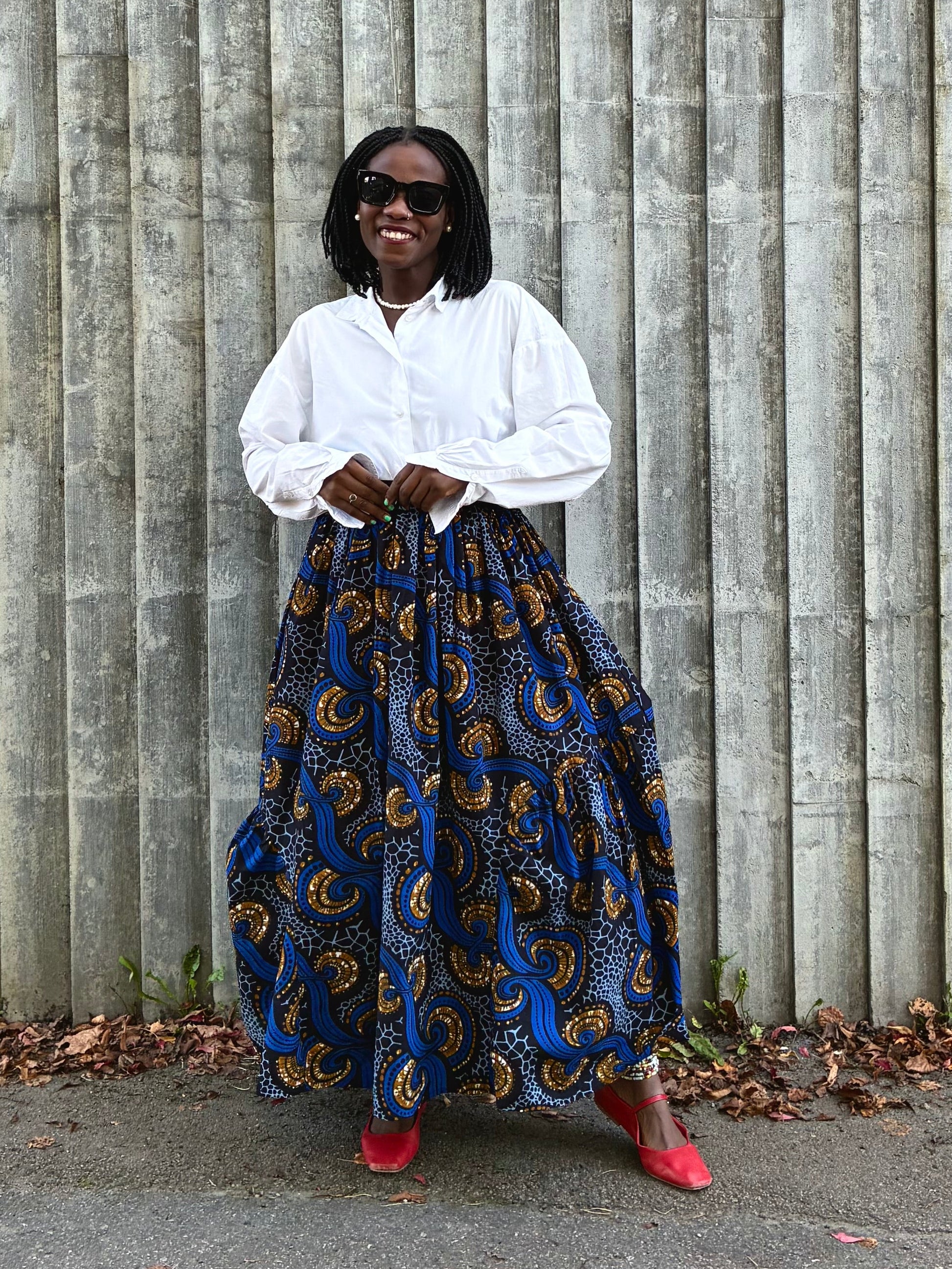 Et langt boho-inspirert skjørt i 100 % bomull med fargerike capulana-mønstre. Komfortabel, tidløs og unik – perfekt til både hverdags og spesielle anledninger.