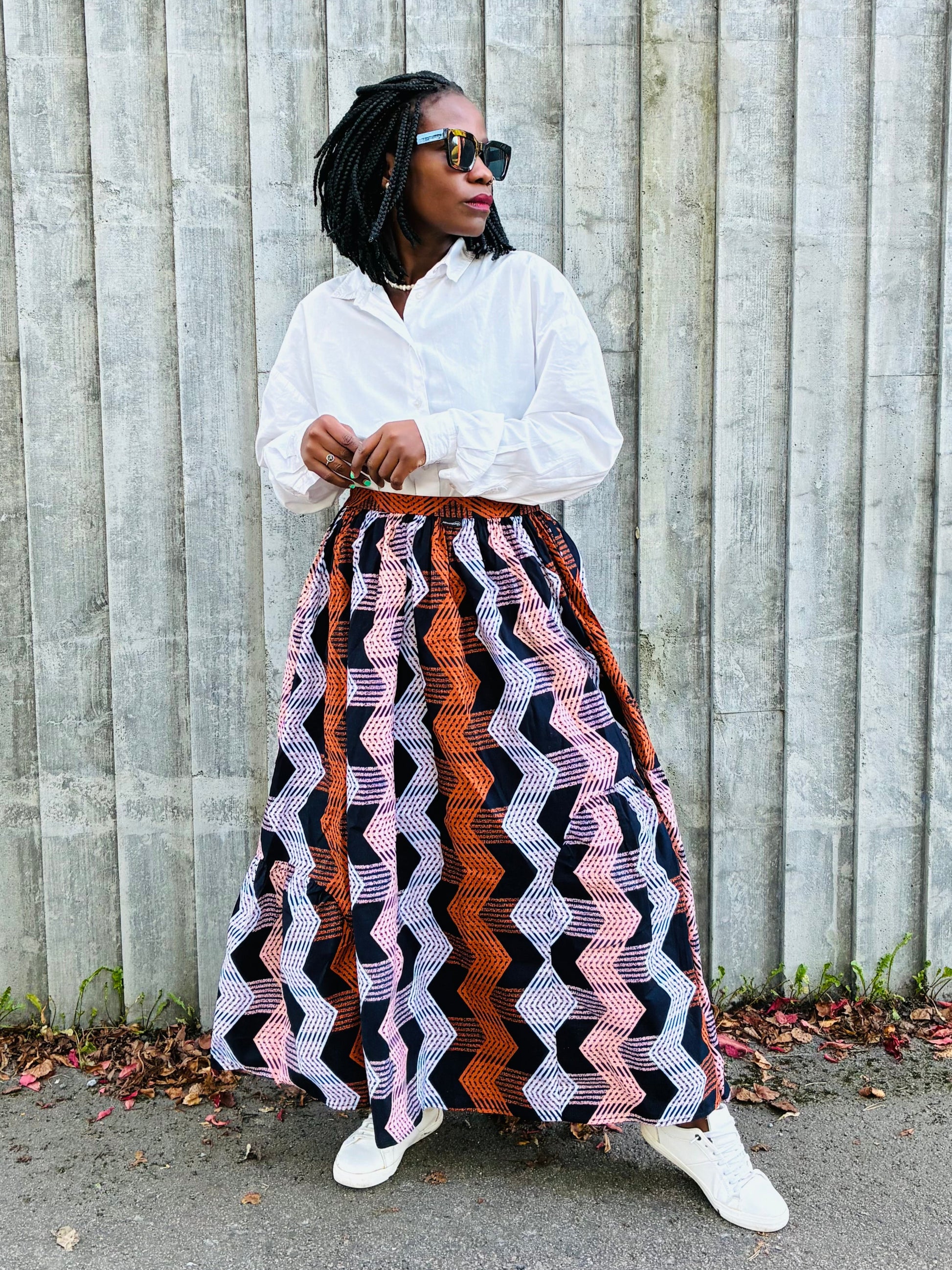 Et langt boho-inspirert skjørt i 100 % bomull med fargerike capulana-mønstre. Komfortabel, tidløs og unik – perfekt til både hverdags og spesielle anledninger.