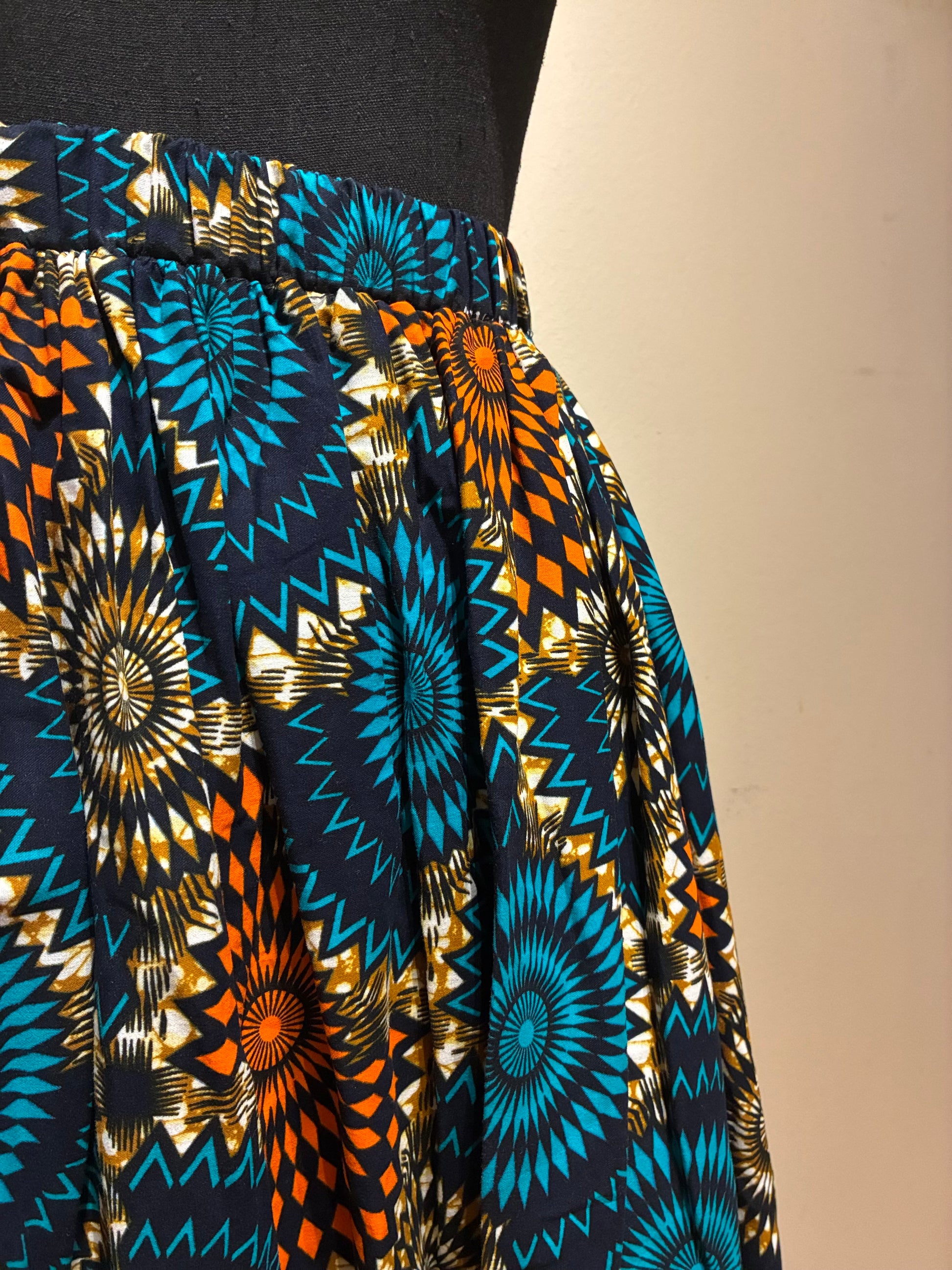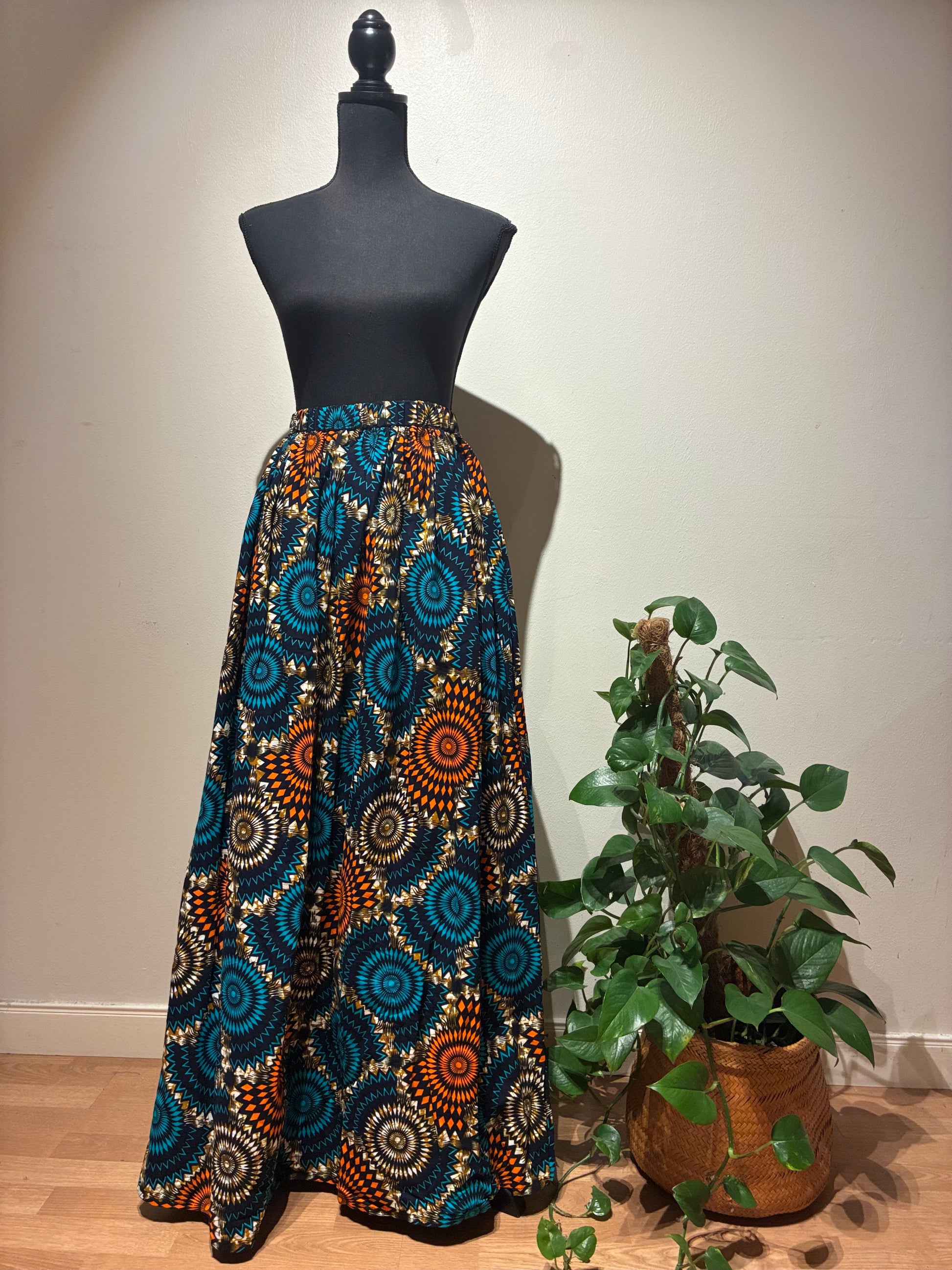 Et langt boho-inspirert skjørt i 100 % bomull med fargerike capulana-mønstre. Komfortabel, tidløs og unik – perfekt til både hverdags og spesielle anledninger.