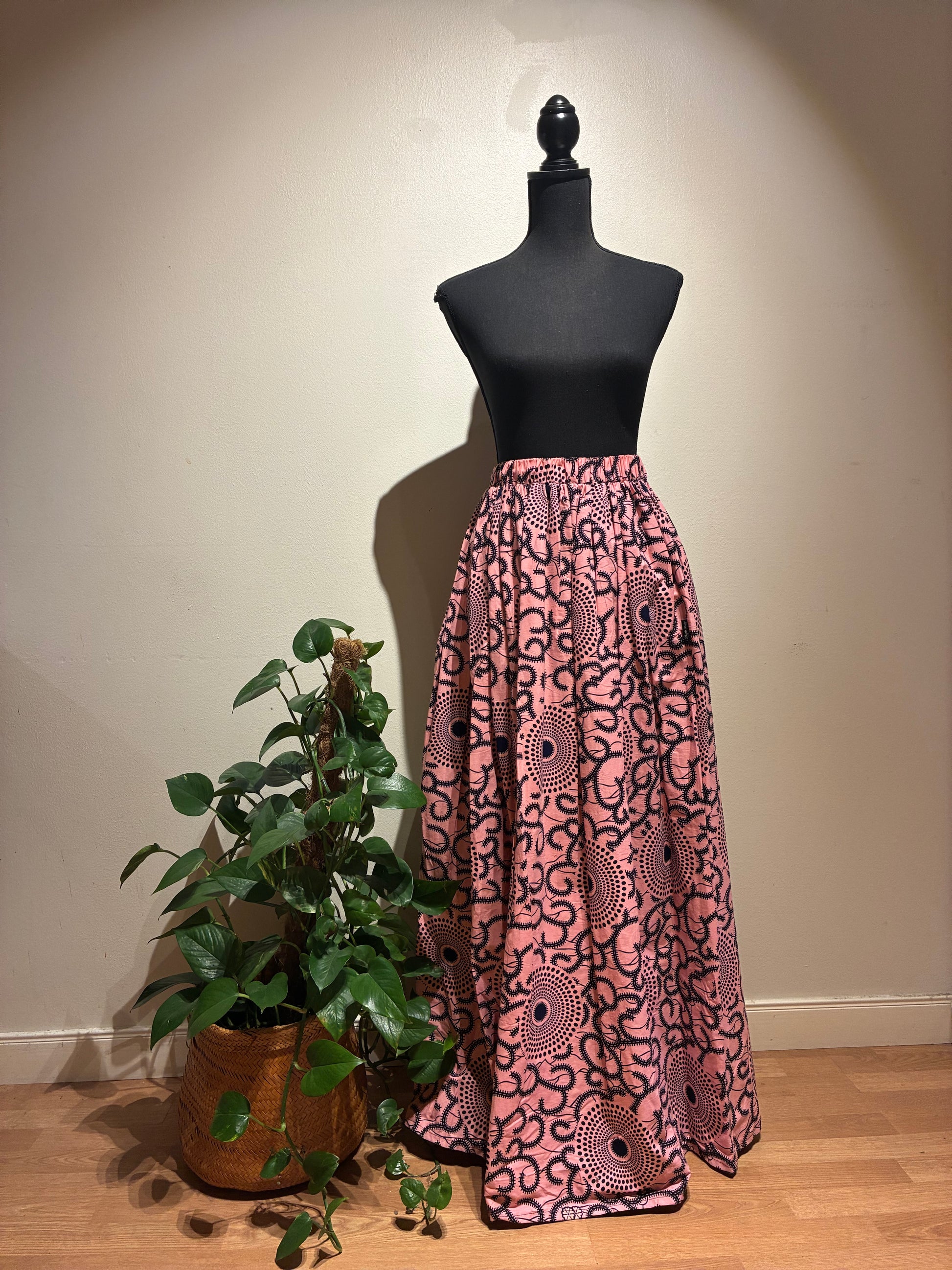 Et langt boho-inspirert skjørt i 100 % bomull med fargerike capulana-mønstre. Komfortabel, tidløs og unik – perfekt til både hverdags og spesielle anledninger.
