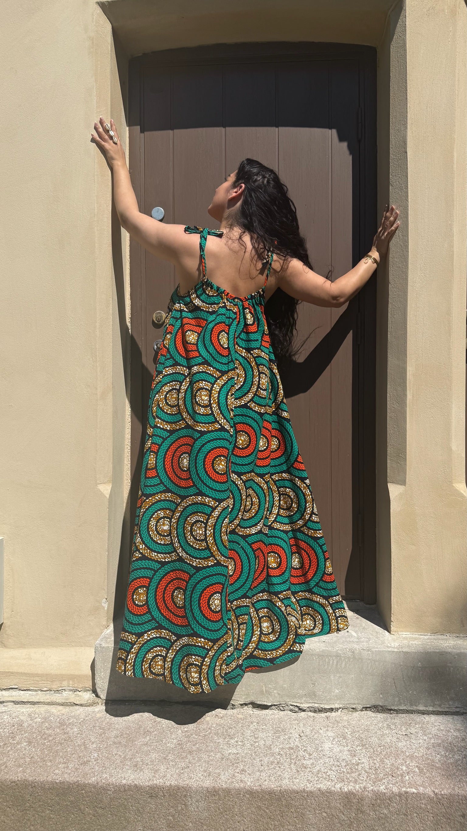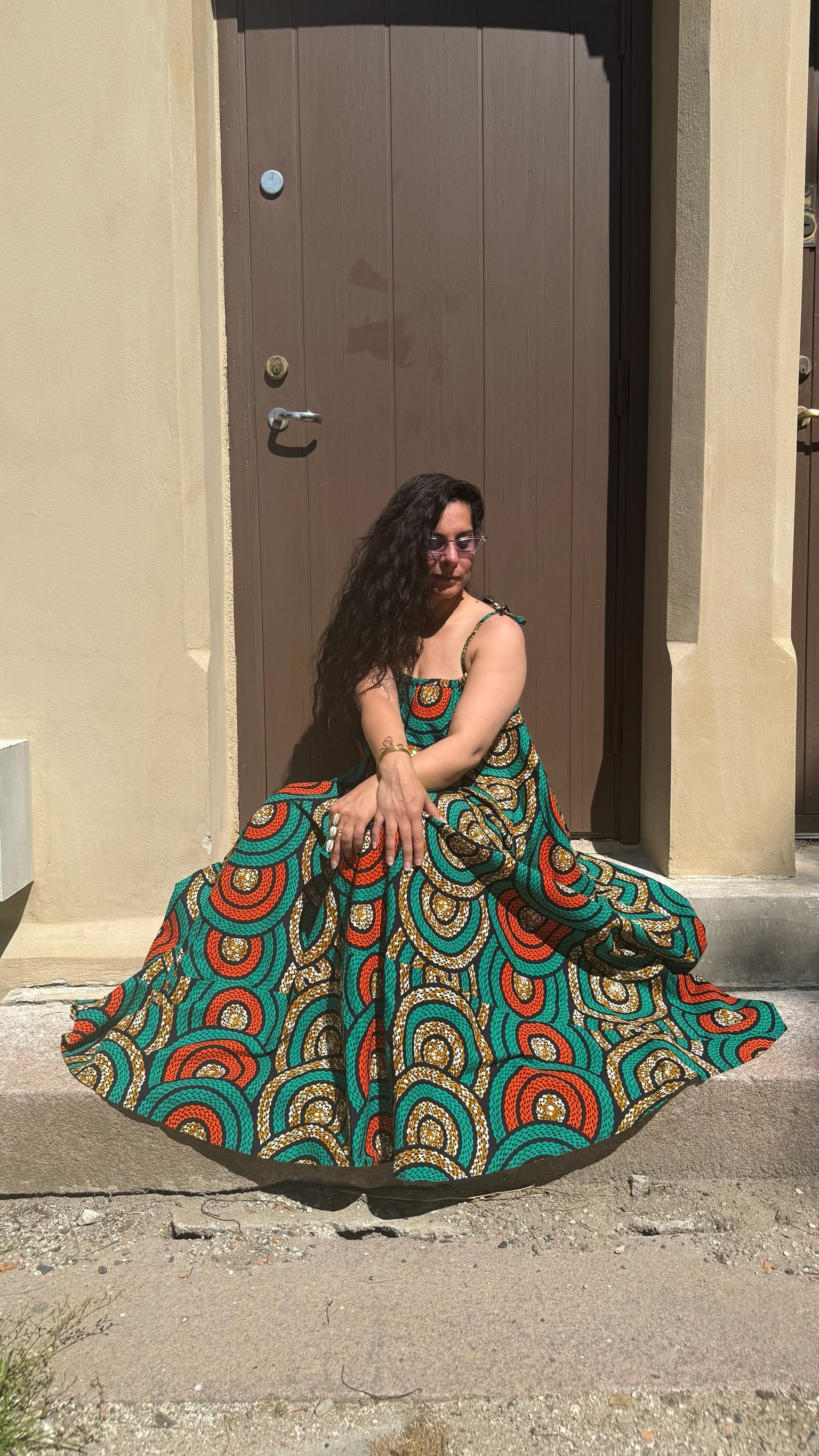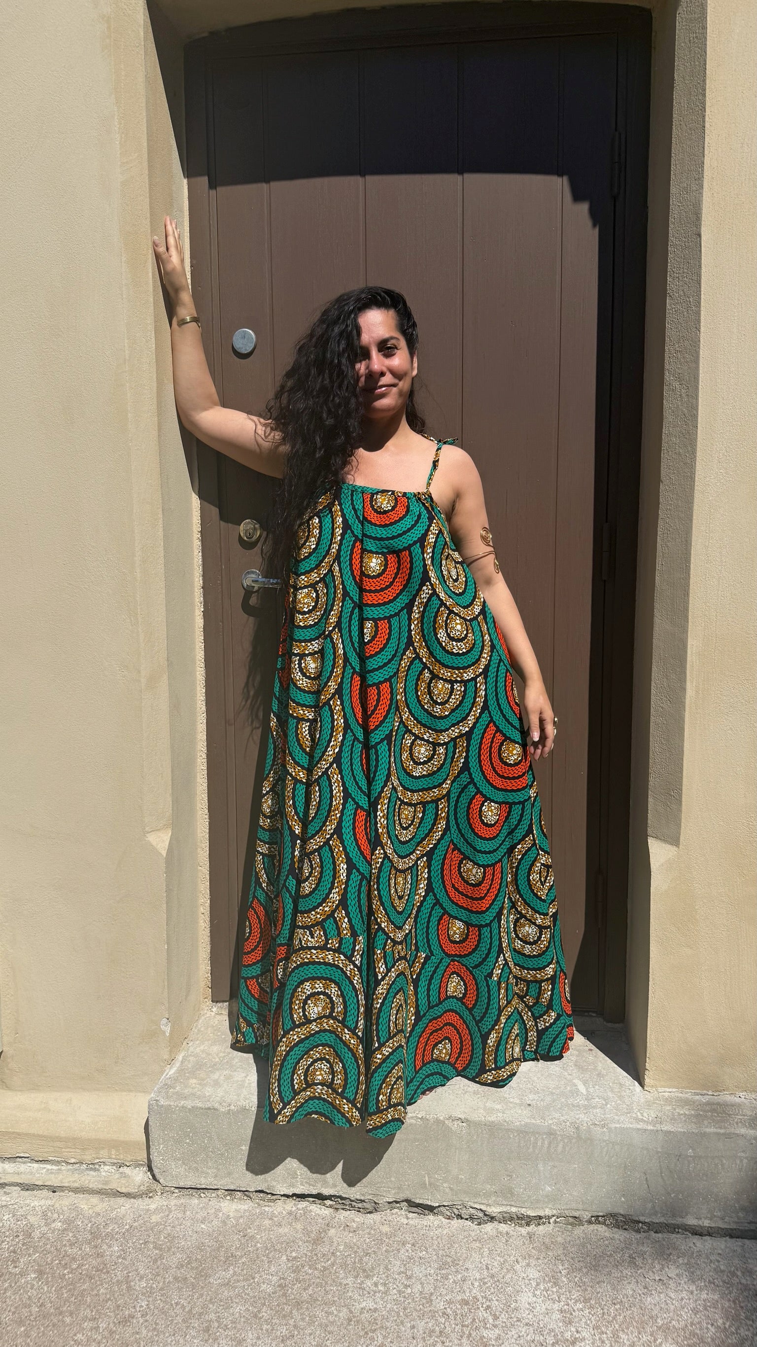 Passer alle størrelser. Modellen er ca. 165 cm høy.Håndlaget i 100% afrikansk stofftrykk på bomull.